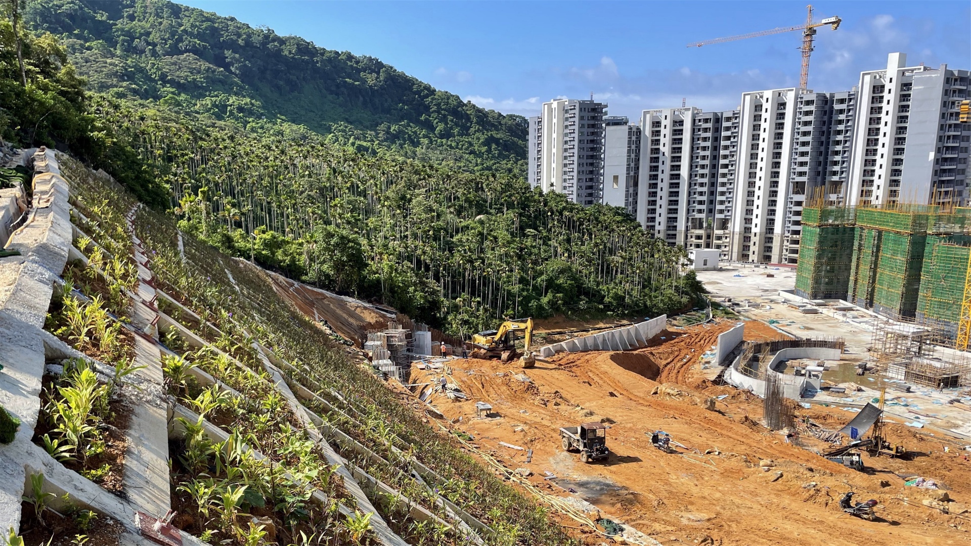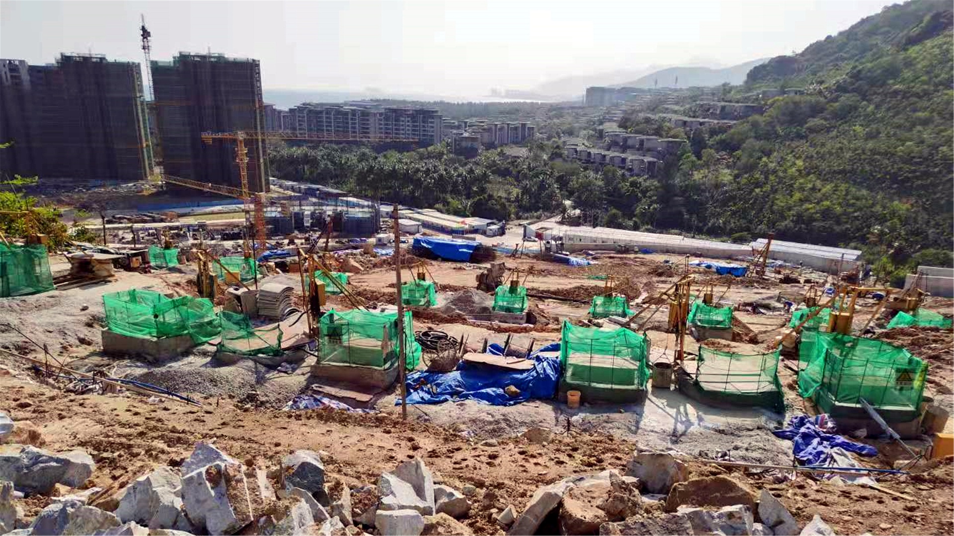 工程类型:人工挖孔抗滑方桩+预应力锚索支护 工程规模/开发商:1769.73万元/华润置地 工程简介:该山体支护工程位于海南万宁市石梅湾,场地原始地形为山前坡地,南侧为石梅湾,开山切坡形成山地住宅区,共形成五级建筑平台,拟建低层山地别墅,山体坡顶至坡脚相对高差达160m,建筑区边坡高差达60m。 边坡支护(含场地周围滑坡处理)主要釆用2~5排人工挖孔桩+预应力锚索支护,后缘山体釆用锚拉框架梁支护形式,并设置被动防护网体系。